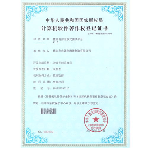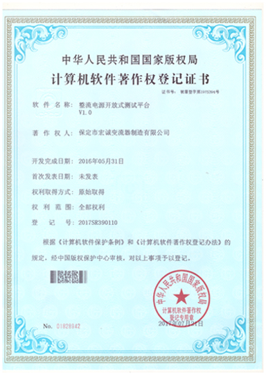計(jì)算機(jī)軟件注冊權(quán)登記證書——整流電源開放式測試平臺V1.0