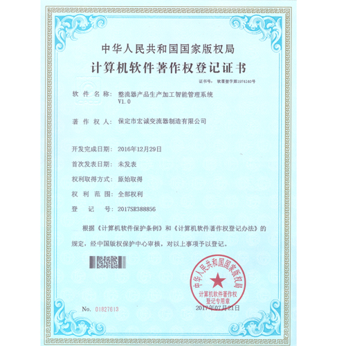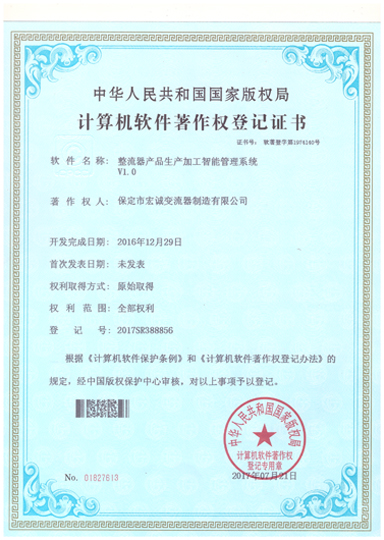 計(jì)算機(jī)軟件注冊權(quán)登記證書——整流器產(chǎn)品生產(chǎn)加工智能管理系統(tǒng)V1.0