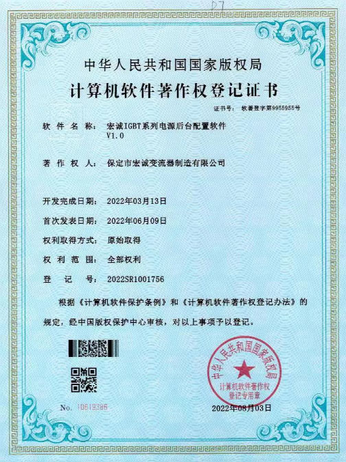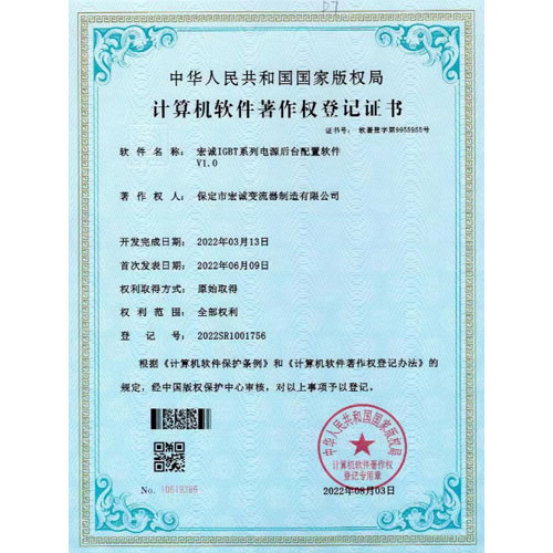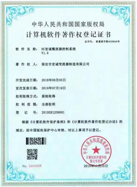 計(jì)算機(jī)軟件著作權(quán)登記證書--HC宏誠整流器控制系統(tǒng)V1.0
