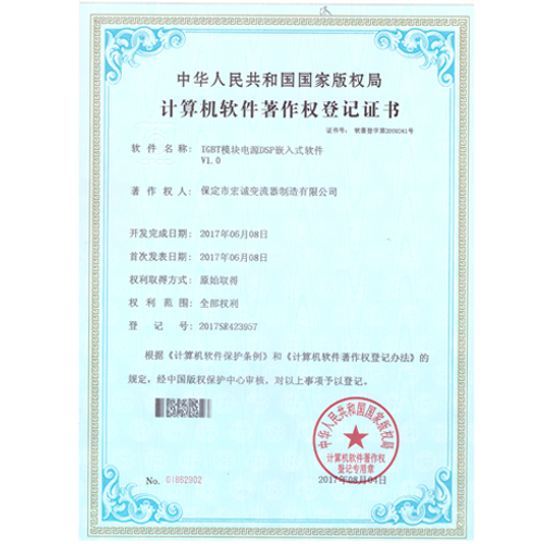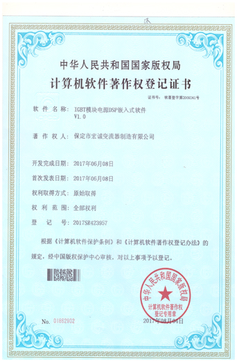 計(jì)算機(jī)軟件注冊(cè)權(quán)登記證書(shū)——IGBT模塊電源DSP嵌入式軟件V1.0