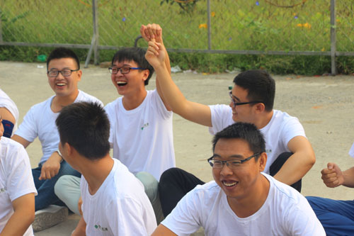 我們先進(jìn)行了拓展前的熱身活動,兩個簡單的小游戲消除了大家彼此間的陌生感,活躍了氣氛。然后,大家被教練分成兩組,并被要求在半小時內(nèi)選出隊長,取隊名,定口號,繪制隊旗,選定隊歌并擺出團(tuán)隊造型。大家都集思廣益,分工合作,各顯其能。
