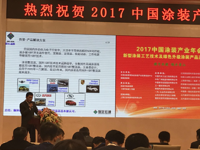 在年會上,我司總經(jīng)理袁世鋒先生以“涂裝電泳安全及節(jié)能的解決新方案——IGBT模塊電源”為題進(jìn)行了演講,重點(diǎn)介紹了IGBT模塊電源的發(fā)展,原理及應(yīng)用?,F(xiàn)場展示了保定宏誠為汽車涂裝行業(yè)服務(wù)過的項目成果。
